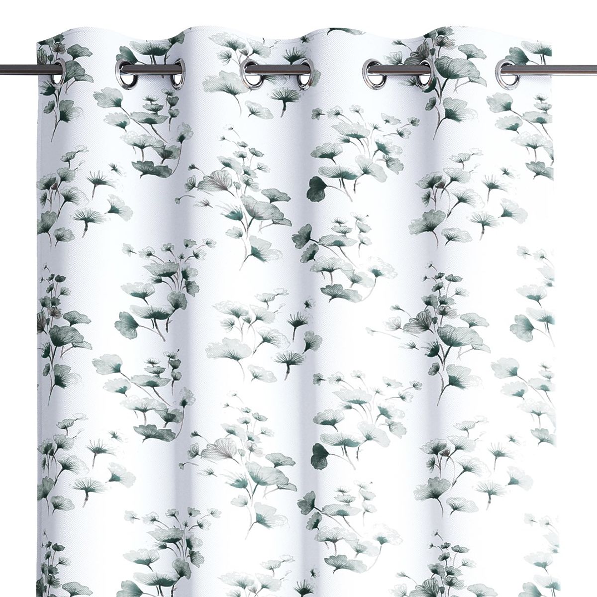 Zavjesa s tiskanim biljnim motivom i srebrnim metalnim ušicama. .. više