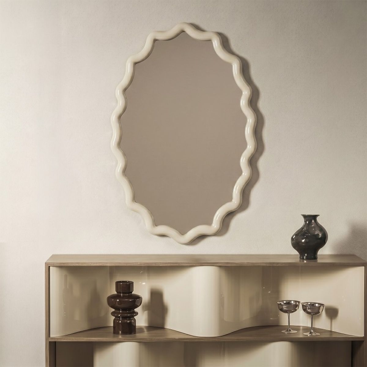 Tražite ogledalo koje će transformirati vaš interijer? Ogledalo Lumi je izvrstan izbor! Njegov dekorativni okvir u mliječno bijeloj nijansi s visokim sjajem dodaje prostoru eleganciju i moderan karakter, savršeno se uklapa u različite aranžmane.