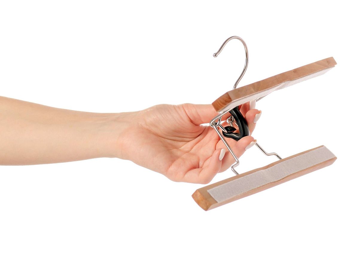 Univerzalna praktična vješalica za pohranu hlača ili drugih dijelova odjeće. Kuka za vješanje je rotirajuća. Pomaže održati red u vašem ormaru i garderobi te štiti odjeću od gužvanja. Vješalica ima protukliznu filcanu podlogu.